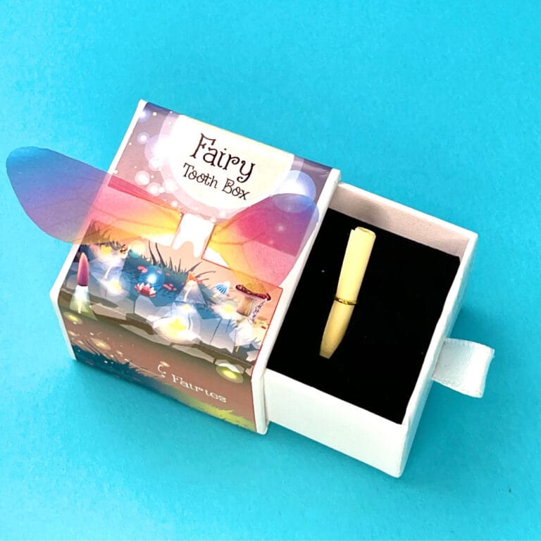Completely enchanting and a lifesaver for parents! Instead of “scavenging” under a pillow and risking a wake-up, the tooth goes in this beautiful keeper box. It even includes a tiny scroll for a note to the Tooth Fairy.